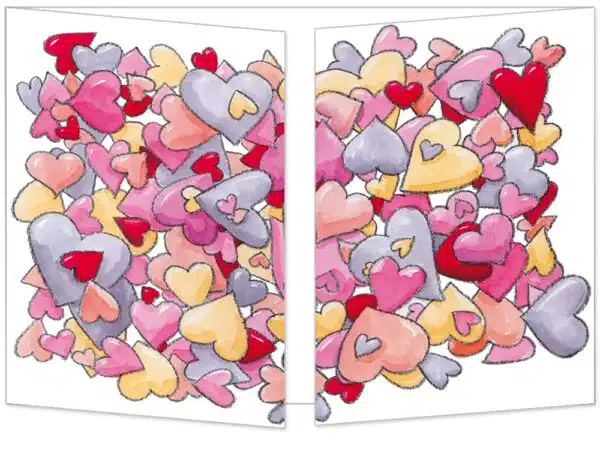 La très jolie image extérieure de cette carte est recouverte d’une grande quantité de cœurs multicolores. Que va nous révéler l’ouverture de cette carte ?