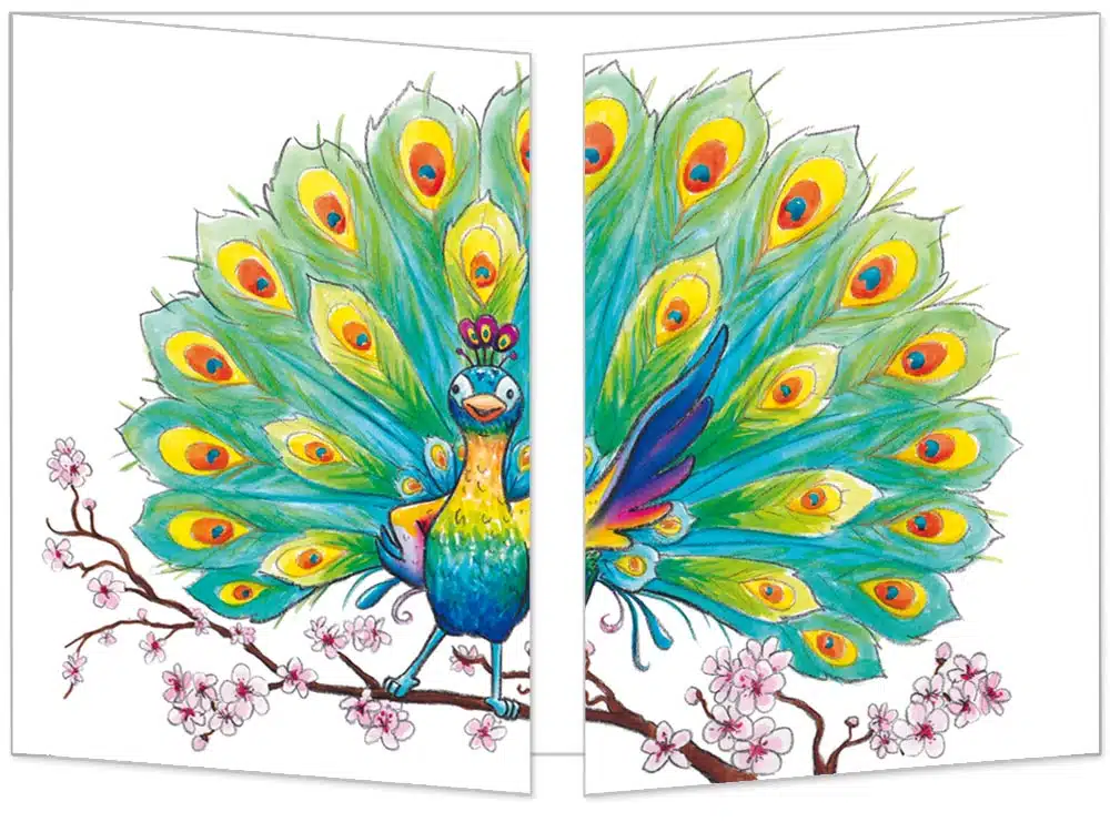 La très lumineuse image extérieure de cette carte nous présente un paon fier et joyeux qui fait la roue… mais que va-t-il se passer à l’intérieur ?