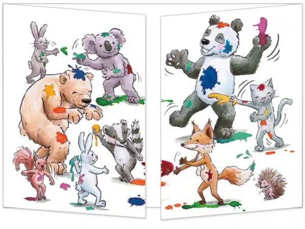 Sur l’extérieur de cette carte postale des animaux font une bataille de couleurs éclatantes ! C’est une joyeuse explosion multicolore : l’ours, le panda, le renard, le chat, le koala, le blaireau, le hérisson, l’écureuil et les lapins ont l’air de bien s’amuser !…