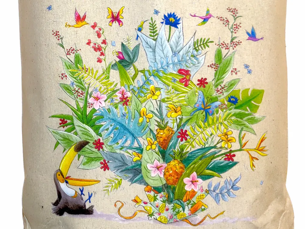 Sac 100% coton contenance 12 litres. Bouquet de fruits et fleurs tropicales surgissant d’un paquet… une belle surprise pour le toucan !